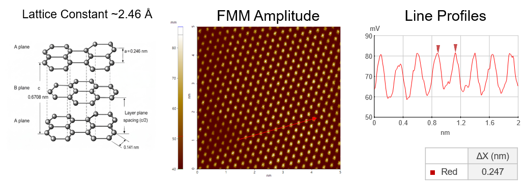Atomic lattice is measured by FMM at a 5 nm scan size, and the measured lattice spacing agrees with the reference value of graphite (~2.46 Å).