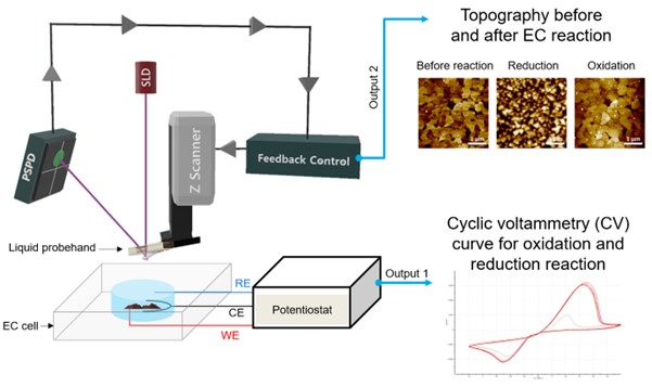 Electrochemistry is an essential study of industries such as batteries, fuel cells, semiconductors, etc. and, more broadly, can be adopted a wide range of research fields ranging from smelting, corrosion, polishing, coating of metals to the manufacture of various organic/inorganic compounds [1]. Electrochemistry examines the interactions of materials while tracking the movement of electrons when a potential is applied to electrodes in electrolyte [1], [2]. By combining cyclic voltammetry (CV) techniques with AFM surface imaging, electrochemical (EC)-atomic force microscopy (AFM) can be used to monitor the surface morphology and behavior of various electrode materials under electrochemical control [3].