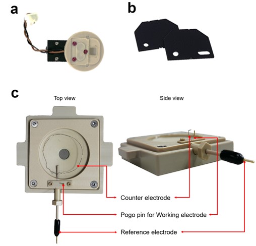 Figure 2. Experimental setup for AFM using EC cell. Park Systems liquid probehand (a), Teflon-coated chip carrier (b), EC cell with three electrodes (c).