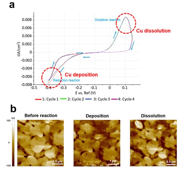 Figure 3. Cu particles deposition and dissolution on Au surface by EC reaction. CV curve indicates reduction and oxidation reaction at the applied -0.4 V and 0.1 V bias, respectively (a), AFM images at each step (b).