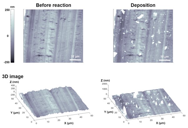 Although there are various solutions to prevent corrosion of metal surfaces, corrosion inhibitors are treated on the surface to form a film such as a passive film on the surface to prevent corrosion. Figure 6(b) compares the degree of corrosion after EC reaction on the cast iron surface treated with corrosion inhibitor under the same conditions as Figure 6(a). Compared to the bare surface, it was confirmed that some debris were observed, but when compared to the cast iron surface without corrosion inhibitor treatment (Figure 6(a)), a clear difference is shown. The result of simultaneously measuring the EC response and the features of a metal surface corroded by an EC reaction is a good example of the usefulness of EC-AFM in metal corrosion research [7].