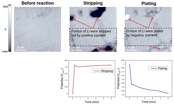 Figure 5 is similar to Figure 4, but it is the result of measuring the behavior according to the EC reaction of Li on a Li metal plate rather than a Cu plate. The measurement conditions were the same, but Li metal was used as the working electrode. The surface morphology of the bare Li metal was characterized by AFM and then, after applying a constant current density of 2mA/cm² while monitoring the required bias at the same location for accurate comparison, it was confirmed that Li was stripped. After that, negative current density of -2mA/cm² was applied, and Li plating was confirmed. The potentiostat enabled tracking of the gradual increase in positive or negative bias to maintain a current density of ±2 mA/cm², confirming the stripping and plating reactions. Li stripping and plating refer to two processes in which Li ions are either removed from or deposited onto the surface of a Li metal, respectively. This process causes a decrease/increase in the concentration of Li ions in the Li metal, which results in a reduction/oxidation in the applied voltage. Both Li stripping and plating are important factors to consider in the design and operation of Li-ion batteries. If the stripping and plating processes are not controlled properly, they can lead to the formation of unwanted Li metal deposits on the electrode surface, which can cause battery failure or even safety issues such as thermal runaway.