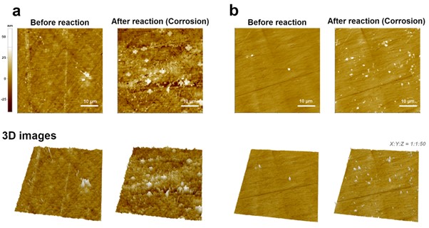 As a final application, the corrosion of the metal surface was measured by EC-AFM. The main purpose of this measurement is to confirm the corrosion of the metal surface according to the EC reaction in an aqueous solution containing salt, and secondly is to compare the degree of corrosion of metals treated with anticorrosive chemicals under the same conditions. In order to check the corrosion of the metal surface by EC response, after setting two metal types (bare cast iron and chemically treated cast iron) as working electrode, reference electrode and counter electrode were Ag/AgCl electrode and Pt-Ir wires, respectively, -0.3 V voltage was applied to investigate the change of the metal surface before and after the reaction. The electrolyte was used 3.5 w% NaCl.