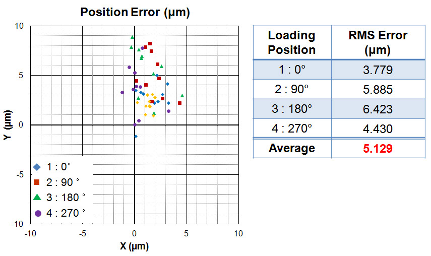 The RMS position error of survey scans are less than 5 μm regardless of wafer loading positions. It means that all the defects are located within ±5 μm using the defect map provided from a defect inspection tool.