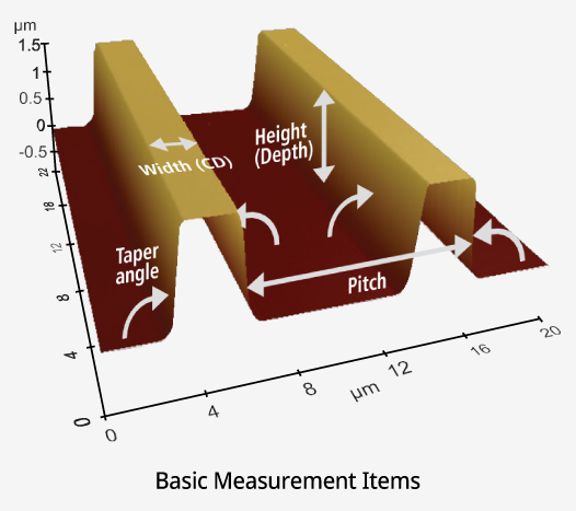 Park AFM precisely measures width (critical dimension), pitch, height (depth), taper angle (side wall angle), and surface roughness.