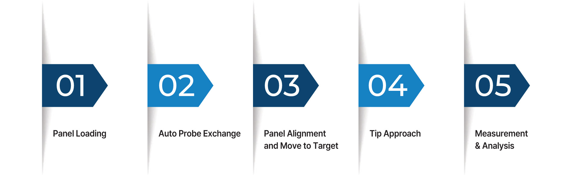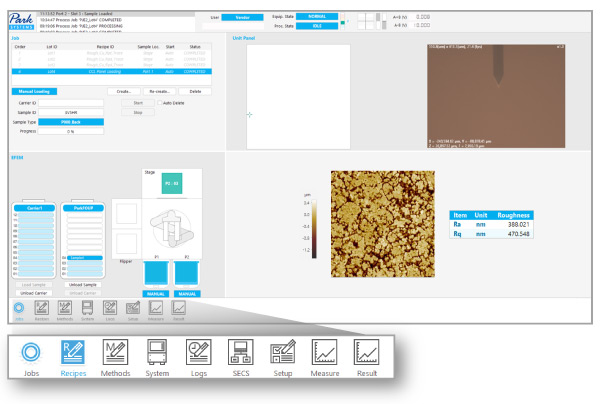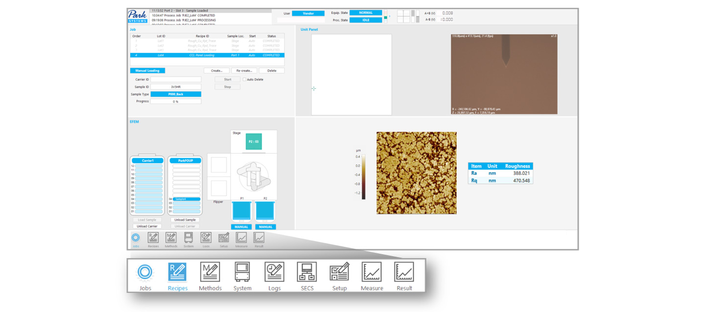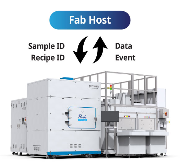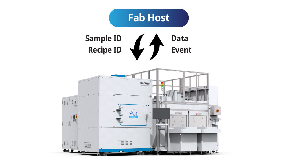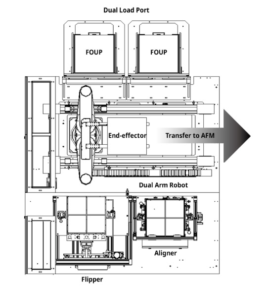 NX-TSH600 is equipped with an EFEM featuring dual load ports and a dual arm robot for efficient panel handling. The pre-aligner precisely positions samples at the center and rotates them to the desired angle, while ID readers recognize sample IDs to determine the type and orientation of each sample. An automated flipper enables AFM measurements on both the front and back sides of the panel.