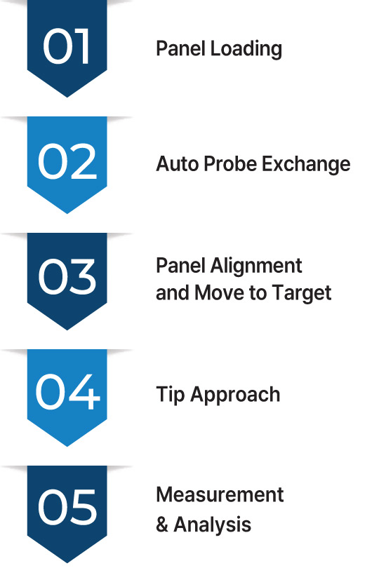 NX-TSH600 enables fully automated operation from panel handling to measurement and analysis. The system automatically receives a recipe from the host, performs end-to-end automation, including selecting the appropriate probe, scanning multiple target areas, analyzing measurement data, and generating reports.