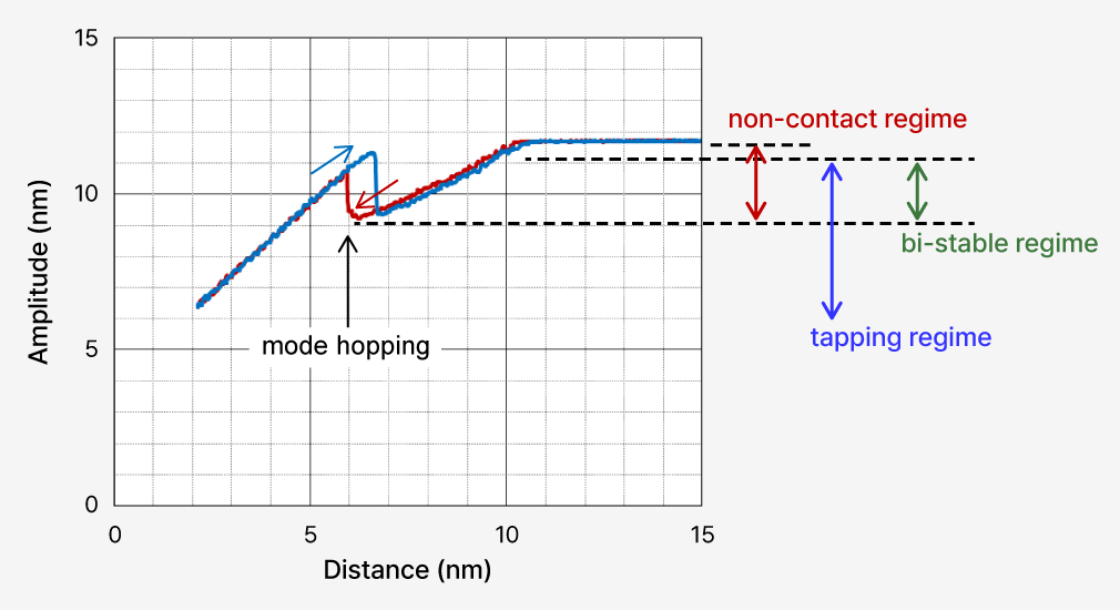 The major difficulty is in implementing True Non-contact mode is that the tip-sample interaction is not monotonic. If the tip approaches too closely, it enters the repulsive force regime, causing a sharp increase in oscillation amplitude and a mode hop from non-contact to tapping. Even retracting the tip above the original transition point does not immediately recover non-contact mode. This bi-stability makes it challenging to maintain the non-contact mode stably.