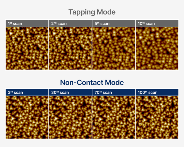 A major advantage of True Non-Contact™ Mode, compared to tapping mode, is the prevention of tip wear and sample damage. The results of repetitive scans on a chromium nitride (CrN) tip-checking sample shows that while the tapping mode image became blurry after just a few scans due to tip wear, the True Non-contact mode image remained sharp even after 100 scans.