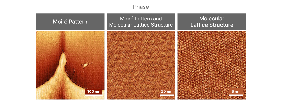 The phase images capture the co-adsorption of melamine and cyanuric acid on an atomically flat HOPG surface, revealing a 2D molecular network with a distinct periodicity of 0.98 nm. Due to lattice mismatch between the molecular network and the underlying HOPG substrate, a Moiré pattern is visualized alongside the lattice structure. This demonstrates Tapping mode’s unique capability to resolve both molecular arrangements and superstructure modulations critical for nanostructure engineering and materials science.