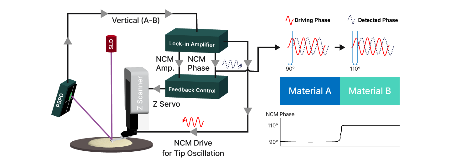 Tapping mode utilizes cantilever oscillation near resonance frequency, intermittently contacting the sample surface to achieve high-resolution topography while minimizing lateral friction forces. The amplitude changes as tip-sample distance and interactions vary, with feedback actively maintaining constant amplitude via Z scanner adjustment—Z position thus representing the sample’s topography. Tapping phase contrast reveals differences in viscoelasticity, adhesion, and stiffness between materials. While this approach is gentler than contact mode, intermittent contact can still degrade delicate tips or soft samples over time. The technique reliably distinguishes relative mechanical properties between regions, as illustrated by phase shifts observed for materials A and B in the schematic.