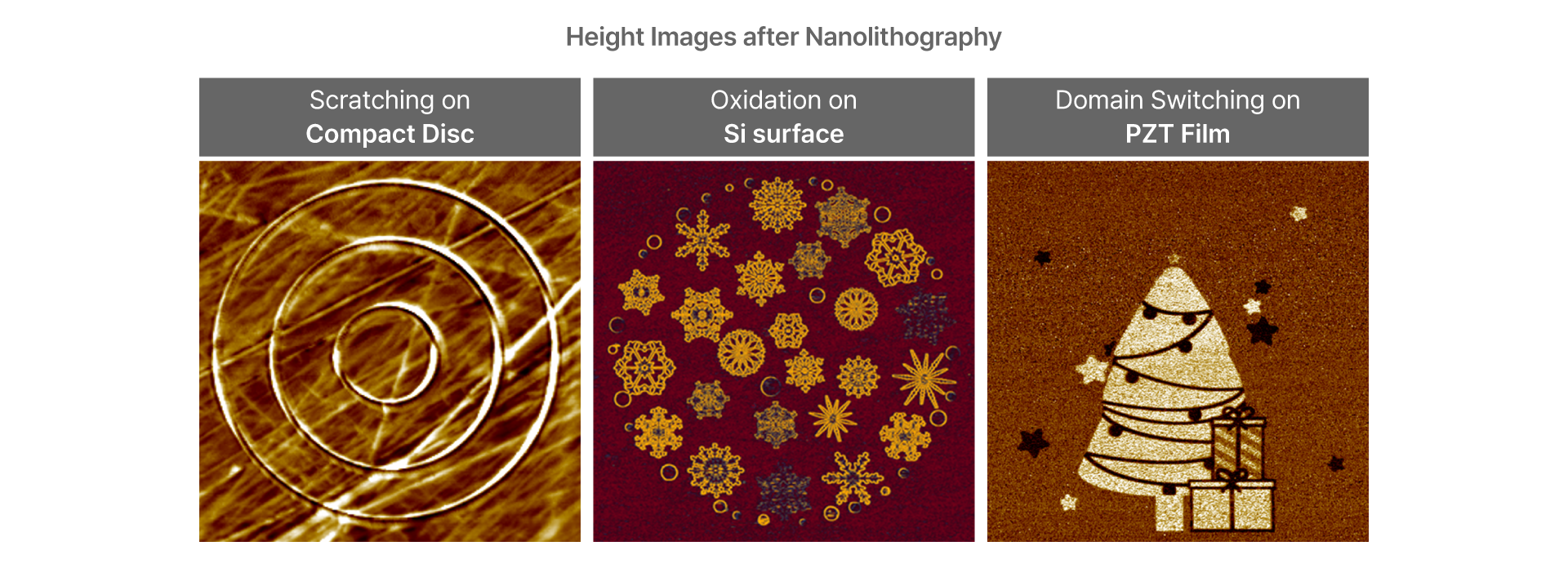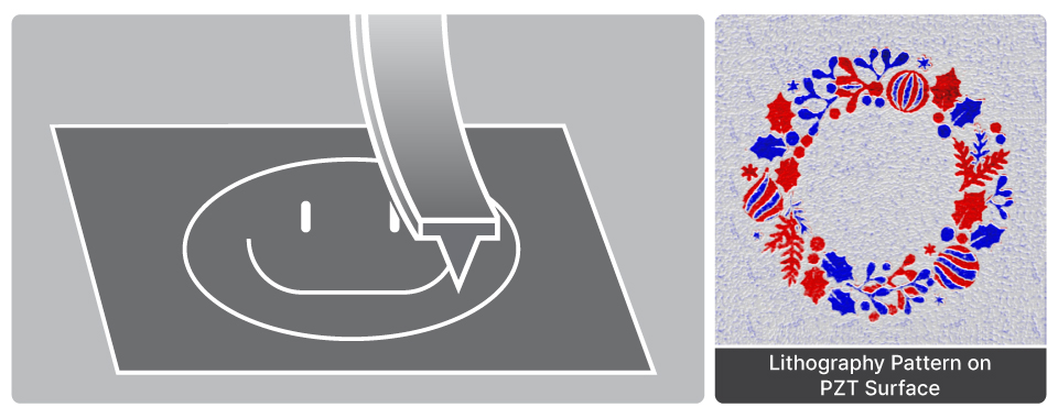 The images indicates AFM nanolithography applied to create a Vincent van Gogh image on a PZT surface by reorganizing ferroelectric domain orientation via tip bias. Using a bitmap design and controlled voltage, localized domain writing was achieved with nanometer precision, highlighting the technique’s capability to fabricate complex functional patterns for data storage, sensors, and advanced materials engineering.