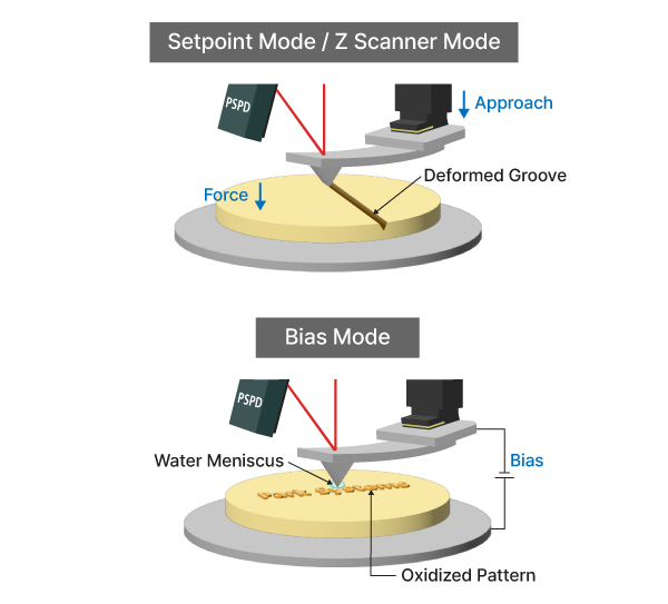 It operates primarily via two mechanisms: bias mode lithography, where an electric field generated by a voltage bias on the AFM tip induces localized chemical modification (such as anodic oxidation) to form nanoscale oxide features on semiconductor or metal surfaces, and force (Setpoint/Z scanner) mode lithography, which uses mechanical motion of the tip under controlled force to physically remove material or deform soft substrates. The process allows for the direct writing of arbitrary patterns with nanometer precision, without the need for masks or resist layers, and enables simultaneous characterization of surface topography and friction using modes like LFM or TFM. AFM nanolithography is particularly advantageous for fabricating prototype nanodevices, testing material properties, and producing features in environments unsuitable for electron beam or ion beam techniques, such as those requiring low energy input or ambient conditions.