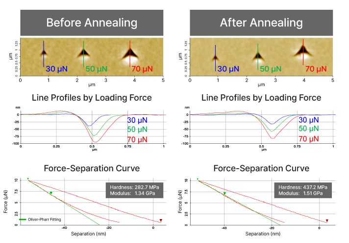 Results illustrate Nanoindentation to study the mechanical properties of carbon-doped hydrogenated silicon oxide (SiOCH) films before and after annealing. Surface profiles and force-separation curves were obtained at various loading forces, allowing precise quantification of hardness and elastic modulus. The results reveal that annealing increases both hardness and modulus, demonstrating the sensitivity and effectiveness of nanoindentation for detecting subtle mechanical changes in thin-film materials.