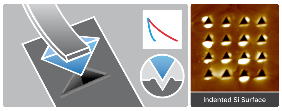 A stiff AFM cantilever equipped with a diamond tip contacts the sample in a controlled manner while the applied force and resulting indentation depth are recorded. This process generates a force–separation curve from which Young’s modulus and hardness (The resistance to permanent deformation) can be calculated, most commonly using the Oliver–Pharr model.